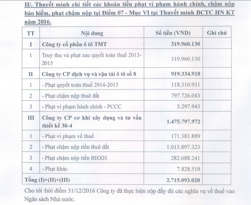 Giải trình về Các khoản tiền phạt vi phạm hành chính, chậm nộp bảo hiểm, phạt chậm nộp, TMT cho biết, cho tới 31/12/2016 Công ty đã thực hiện nộp đầy đủ các nghĩa vụ thuế vào Ngân sách Nhà nước.