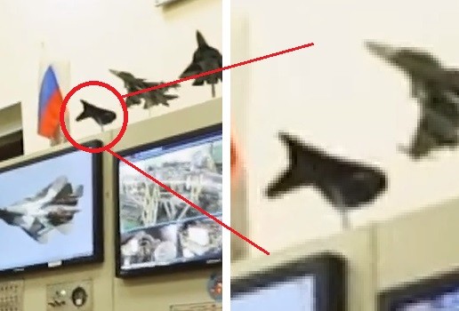 Mô hình gây sự chú ý của các chuyên gia quân sự phương Tây xuất hiện vào phút thứ 20.05, khi phóng viên truyền hình Zvezda giới thiệu các thử nghiệm động cơ phản lực điều khiển vector, tương tự như động cơ “giai đoạn II” lắp trên máy bay Su-57. Trên nóc tủ điều khiển buồng thử nghiệm động cơ có một loạt máy bay mô hình, trong đó có các máy bay thử nghiệm khác nhau như MiG -1.44, Su-47. Trên nóc tủ điều khiển có cả Su-57, phía ngoài cùng là một mô hình máy bay nhỏ với 2 cánh đuôi rộng, không có cánh ổn định bay.