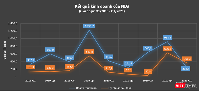 Loại trừ đi các chi phí thuế thu nhập doanh nghiệp, NLG báo lãi ròng 366,3 tỉ đồng Quý 1/2021, cao gấp 3 lần cùng kỳ năm trước và cũng là mức lãi cao nhất so với cùng kỳ 4 năm trở lại đây.