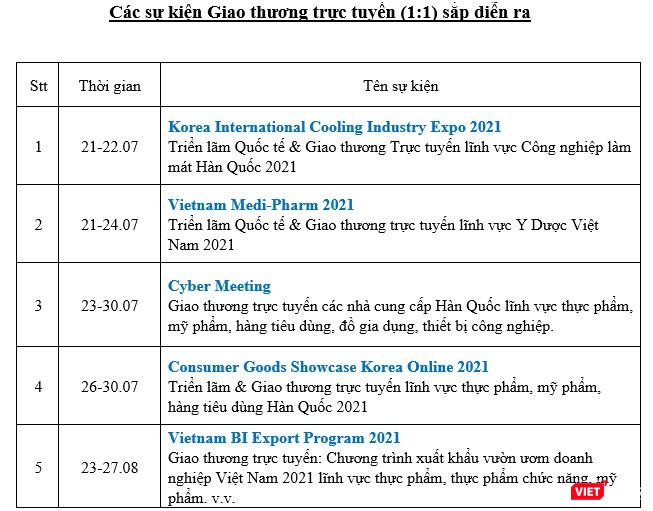 Để tiếp tục hỗ trợ, kết nối giao thương cho các doanh nghiệp Hàn Quốc và Việt Nam, trong tháng 7/2021, KOTRA phối hợp tổ chức chuỗi các sự kiện triển lãm, giao thương trực tuyến. Chuỗi sự kiện này bao gồm: Triển lãm và giao thương trực tuyến lĩnh vực phụ tùng ô tô tỉnh Ulsan; Giao thương trực tuyến với doanh nghiệp cung cấp Hàn Quốc tỉnh Jeonbuk lĩnh vực thực phẩm, mỹ phẩm, hàng tiêu dùng…;