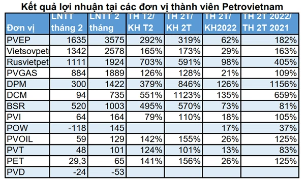 Mang về lợi nhuận nhiều thứ 2 PVN là liên doanh Việt – Nga Vietsovpetro (PVN sở hữu 51% cổ phần) với 1.342 tỷ đồng trong tháng 2 và 2.578 tỷ đồng trong 2 tháng đầu năm, tăng 163% so với cùng kỳ.