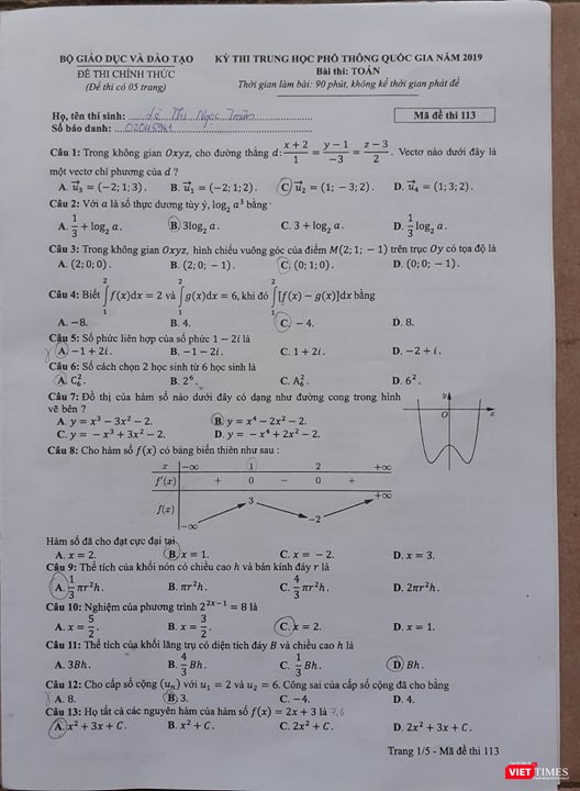 Đề thi môn Toán của kỳ thi THPT quốc gia 2019