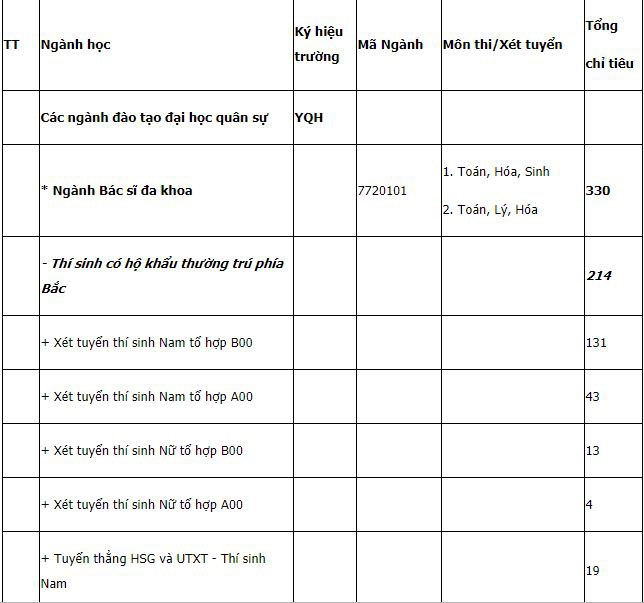Chỉ tiêu theo phương thức xét điểm thi THPT quốc gia của Học viện Quân y