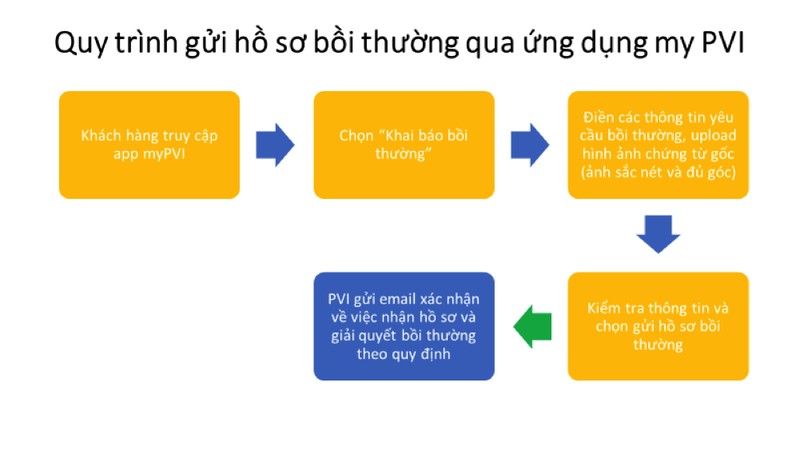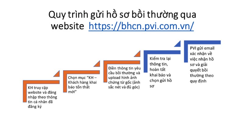 Nhằm mang đến cho Khách hàng dịch vụ có chất lượng cao và thuận tiện trong việc gửi hồ sơ yêu cầu bồi thường khi không may xảy ra sự kiện bảo hiểm, Bảo hiểm PVI đã xây dựng phương thức khai báo bồi thường trực tuyến (online) để khách hàng có thể khai báo hồ sơ bồi thường mọi lúc mọi nơi mà không phụ thuộc vào thời gian hoặc không gian, không cần phải gửi kèm theo các chứng từ giấy truyền thống, tiết kiệm chi phí chuyển phát hồ sơ và hoàn toàn bảo mật. Quan trọng nhất, khách hàng theo dõi được tiến trình giải quyết hồ sơ của mình chỉ bằng cách tải ứng dụng app myPVI trên Appstore/CH play và truy cập website:bhcn.pvi.com.vn.