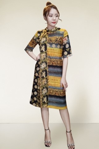 Nếu các chị em đang tìm kiếm một phong cách mới lạ, khác biệt một xíu cho năm 2020 thì mẫu T5117 chính là đáp án. Thiết kế độc đáo 2 tà xẻ trước, họa tiết hơi hướng thổ cẩm với những bông cúc họa mi trải dài cùng màu sắc được phối hợp lý. Khoác chiếc đầm này lên người chỉ nhìn thôi là đã thấy sự sang trọng, quý phái toát ra từ từng chi tiết.