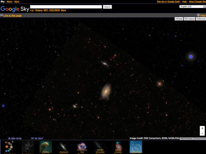 Google Sky cho phép bạn khám phá vũ trụ bằng cách sử dụng hình ảnh từ vệ tinh của NASA, khảo sát trên bầu trời kỹ thuật số Sloan và Kính thiên văn Hubble.