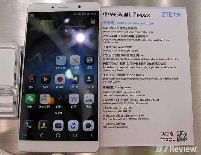 Trong khi đó ZTE trình diễn loạt smartphone tối ưu cho bảo mật, đặc biệt là smartphone ZTE 7 MAX chuyên dụng cho lực lượng cảnh sát, tích hợp chip mã hóa, file hệ thống kép, bảo vệ phân vùng khởi động... Máy sử dụng vi xử lý Snapdragon 625, 4GB RAM, 64GB ROM, màn hình 6" Full HD, camera kép 13MP + 13MP, camera trước 13MP, pin 4100 mAh có sạc nhanh.