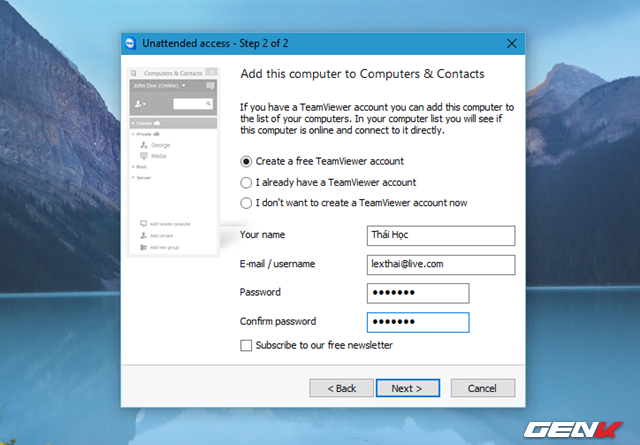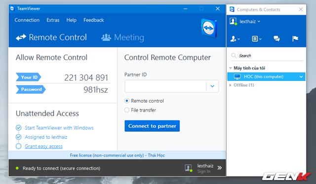 Sau khi hoàn thành việc khởi tạo tài khoản, tên máy tính sẽ xuất hiện ở cửa sổ Computers & Contacts của TeamViewer.