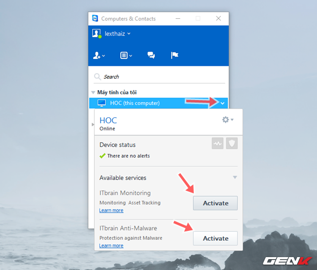Bây giờ, để kích hoạt tính năng ITbrain trên các máy tính kết nối, bạn hãy nhấp chọn tên máy tính cần làm việc và nhấn vào mũi tên hướng xuống, sau đó lần lượt nhấn vào tùy chọn Activate ở 2 mục dịch vụ ITbrain Monitoring và ITbrain Anti-Malware.