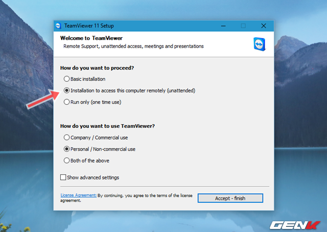 Ở màn hình cài đặt đầu tiên, bạn hãy đánh dấu vào tùy chọn “Installation to access this computer remotely (unattended)” ở phần “How do you want to procceed?” và đánh dấu vào mục lựa chọn hình thức sử dụng TeamViewer phù hợp với mục đích sử dụng ở phần “How do you want to use TeamViewer?”. Sau đó nhấn Accept – finish để bắt đầu quá trình cài đặt.