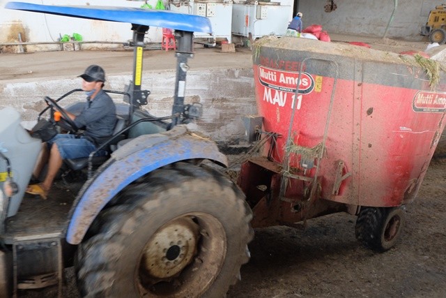 Thức ăn sau khi được trộn đưa đến từng chuồng bò. Một chiếc xe máy xúc được 1 công nhân vận hành có thể phục vụ 1000 con bò một ngày, với tất cả các công đoạn.