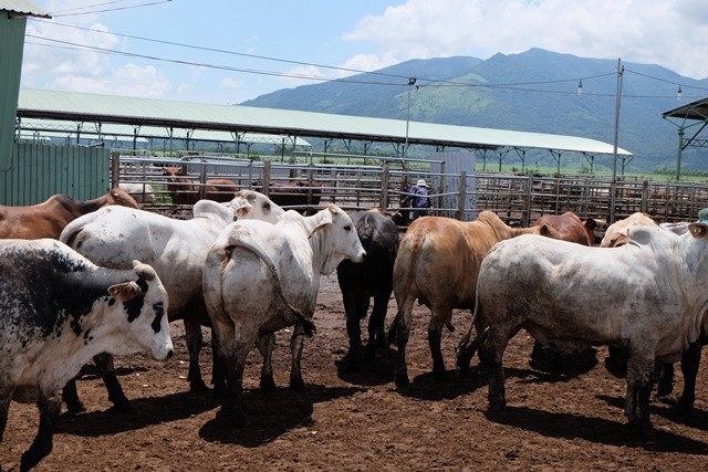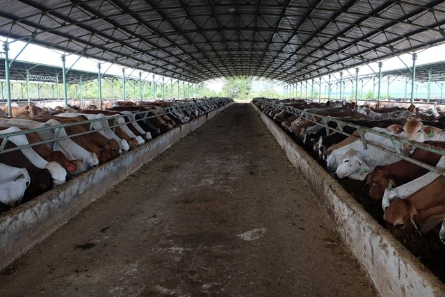 Đàn bò mới được nhập về có trọng lượng khoảng 250kg mỗi con, được nuôi trong chuồng với thức ăn công thức.