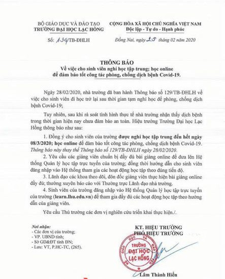 Mới đây trường ĐH Lạc Hồng (Đồng Nai) cũng chính thức có thông báo về việc cho sinh viên nghỉ học tập trung; học online để đảm bảo tốt công tác phòng, chống dịch bệnh Covid-19. Cụ thể, sinh viên của trường sẽ được nghỉ học tập trung đến hết ngày 08/3/2020; học online để đảm bảo tốt công tác phòng, chống dịch bệnh Covid-19 (Thông báo này thay thế Thông báo số 129/TB-ĐHLH ngày 28/2/2020).