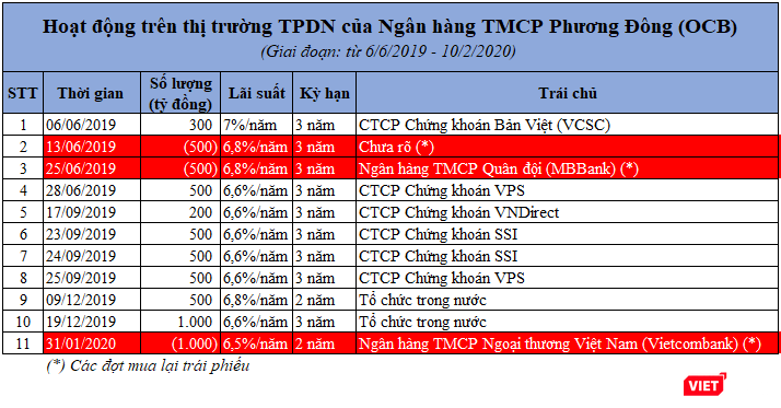 Theo thống kê của VietTimes, trong giai đoạn từ 6/6/2019 - 10/2/2020, Ngân hàng TMCP Phương Đông (OCB) hoạt động khá tích cực trên thị trường trái phiếu doanh nghiệp, với tổng cộng 11 đợt phát hành riêng lẻ và mua lại trái phiếu trước hạn được công bố.