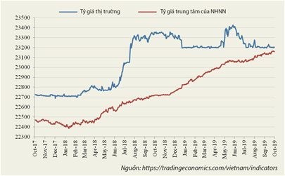Tính từ cuối năm 2018 đến nay, trong khi tỷ giá trên thị trường không thay đổi, giữ nguyên ở mức giá mua vào của NHNN là 23,200 đồng/đô la Mỹ thì tỷ giá trung tâm đã tăng tới 1,47%. Nhờ vậy mà khoảng cách giữa hai tỷ giá đã được thu hẹp từ mức 370 đồng vào đầu năm 2019 xuống chỉ còn 40 đồng/đô la Mỹ vào thời điểm hiện tại.