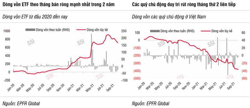 Theo SSI, dòng tiền đầu tư có xu hướng tiêu cực trong thời gian qua khi sức hấp dẫn của thị trường chứng khoán Việt Nam giảm sút đến từ nhiều lý do khách quan và chủ quan. Tâm lý nhà đầu tư bị ảnh hưởng nghiêm trọng khi hoạt động sản xuất, đặc biệt là chuỗi cung ứng bị đứt gãy (xuất khẩu tháng 8 giảm 1,7%, trong khi các quốc gia trong khu vực đều tăng trưởng 2 chữ số).