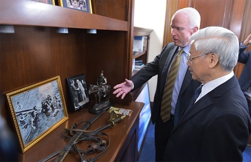 Ông McCain còn giới thiệu một bức ảnh chụp cha mình, từng là một tư lệnh chỉ huy hải quân Mỹ tại Thái Bình Dương trong thời kỳ chiến tranh Việt Nam. “Còn đây là ảnh chụp tại DMZ (khu quân sự) vào lúc giáng sinh khi tôi đang ở trong tù”, ông McCain giải thích bức ảnh. Thượng nghị sĩ John McCain còn gợi nhớ Tổng Bí thư về khu trục hạm USS John McCain – con tàu mang tên cha và ông nội của ông – đã cập cảng thăm Đà Nẵng hồi năm 2010. “Tôi nghĩ đó là biểu tượng của mối quan hệ của chúng ta”, thượng nghị sĩ McCain nói.