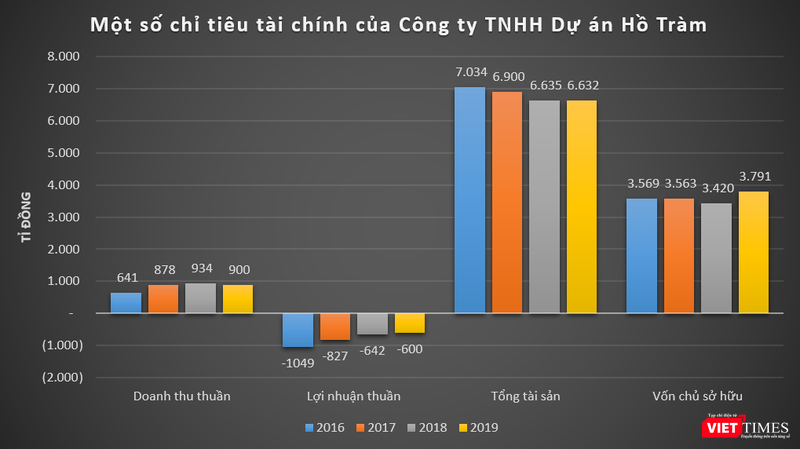 Cụ thể, năm 2016 và 2017, doanh thu thuần của Hồ Tràm lần lượt đạt 641 tỉ đồng và 878 tỉ đồng, lỗ thuần tương ứng ở mức 1.049 tỉ đồng và 827 tỉ đồng. Năm 2019, Hồ Tràm ghi nhận doanh thu đạt 900 tỉ đồng, báo lỗ thuần ở mức 600 tỉ đồng, trong khi năm 2018 lỗ 642 tỉ đồng.