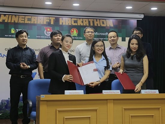 Đại diện 3 đơn vị đồng tổ chức, Hội đồng đội Trung ương, Học viện TEKY và Microsoft Việt Nam ký kết khởi động “Tài năng công nghệ nhí – Minecraft Hackathon”.