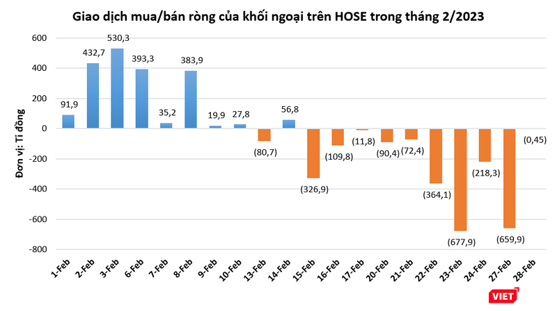 Khối ngoại bán ròng 640 tỉ đồng trên HOSE trong tháng 2/2023