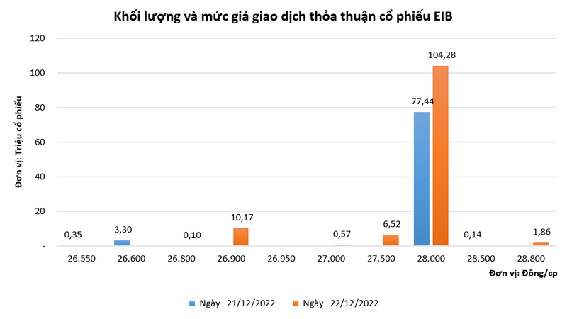Tương tự phiên giao dịch liền trước, khối ngoại tiếp tục đóng vai trò chủ đạo trong các giao dịch thỏa thuận. Tuy nhiên, thay vì mua vào cổ phiếu EIB, họ đã bán thỏa thuận 101,7 triệu đơn vị, tương ứng với giá trị giao dịch đạt 2.848,9 tỉ đồng.