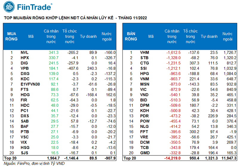 Trong tháng 11/2022, nhà đầu tư cá nhân bán ròng chủ yếu các mã VHM (-1.612,5 tỉ đồng), STB (-1.328 tỉ đồng), CTG (-1.231,5 tỉ đồng), SSI (-1.212,1 tỉ đồng), HPG (-963,6 tỉ đồng).