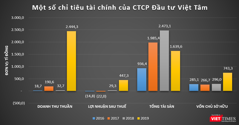 Dữ liệu của VietTimes cho thấy, kết quả kinh doanh của Việt Tâm có sự tăng trưởng mạnh vào năm 2019 với doanh thu thuần 2.444,3 tỉ đồng, lãi sau thuế 447,3 tỉ đồng, lần lượt cao gấp 74,7 lần và 15,2 lần so với năm 2018.