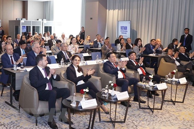 Chủ tịch Quốc hội Vương Đình Huệ và đại biểu dự Diễn đàn Chính sách, Pháp luật Thúc đẩy Hợp tác Kinh tế, Thương mại, Đầu tư Việt Nam-Bulgaria. (Ảnh: Doãn Tấn/TTXVN)
