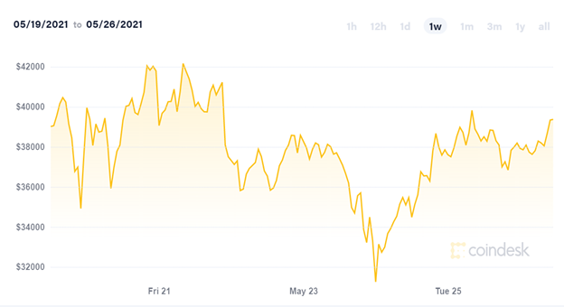 Tất cả các loại tiền điện tử đều sụt giá vào tuần trước, trong đó Bitcoin mất đi 1/3 giá trị chỉ trong vài giờ. Giá Bitcoin tăng vọt trở lại đến gần 40.000 USD ngày 24.5 nhưng vẫn thấp hơn 33% so với mức cao nhất trước đó.
