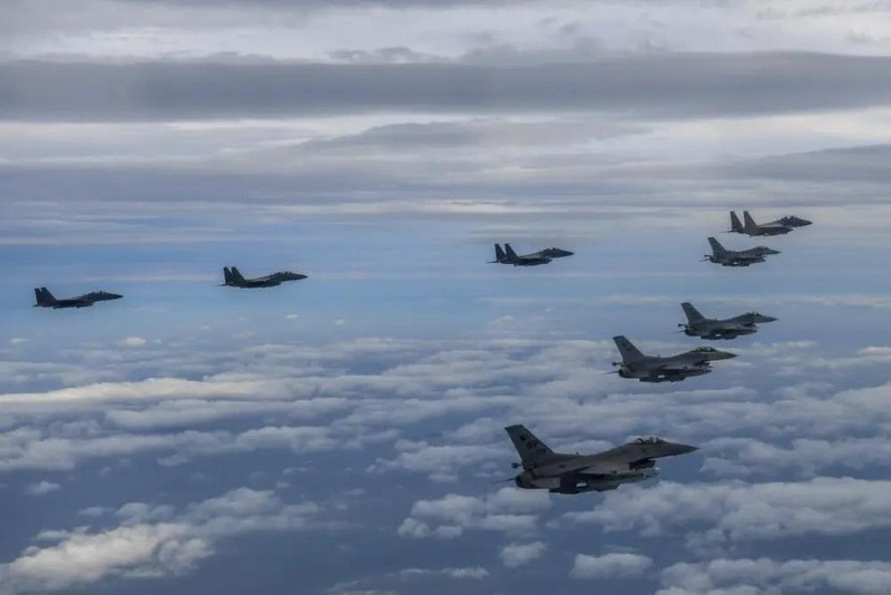 Hàn Quốc và Mỹ thực hiện chuyến bay của phi đội hỗn hợp tấn công và ném bom chính xác vào ngày 4/10/2022 trên đảo Jikdo sau vụ phóng tên lửa đạn đạo của Triều Tiên. Ảnh Tham mưu trưởng Liên quân Hàn Quốc |