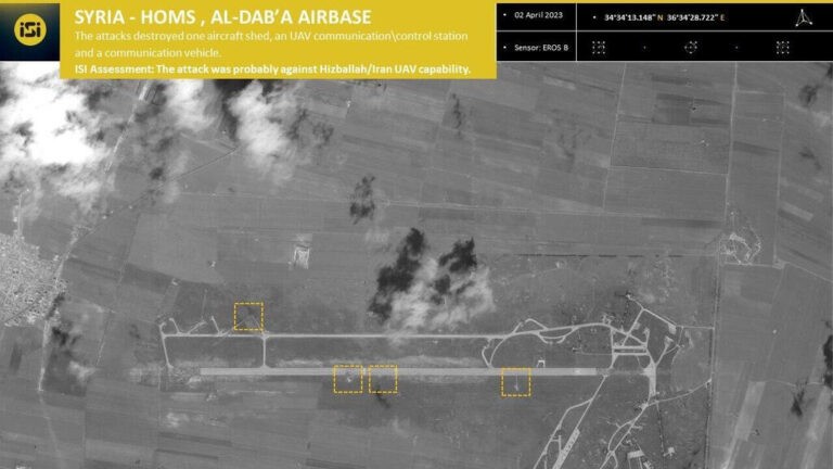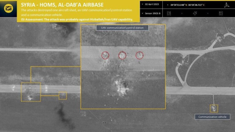 Công ty ImageSat International của Israel đã công bố những bức ảnh vệ tinh mới của căn cứ không quân al-Dabaa ở tỉnh Homs, mục tiêu mà không quân Israel đã tiến hành nhiều cuộc không kích vào sáng sớm ngày 2/4.