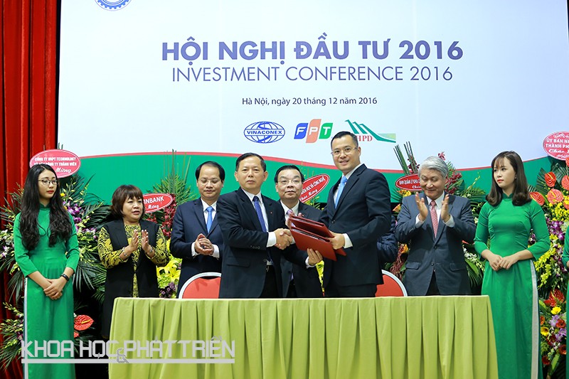 Thứ trưởng Bộ KH&CN, trưởng Ban Quản lý Khu CNC Hòa Lạc Phạm Đại Dương (bên phải) và ông Phan Văn Kiệm (bên trái) đại diện Viện Hàn Lâm Khoa học và Công nghệ Việt Nam ký kết hợp tác để thúc đẩy hoạt động nghiên cứu phát triển, bồi dưỡng nguồn nhân lực trình độ cao, chất lượng cao tại Khu CNC Hòa Lạc.