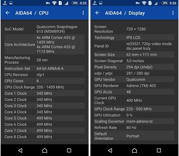 Chẳng hạn tại mục “CPU”, ứng dụng sẽ hiển thị thông tin chi tiết về bộ vi xử lý trên sản phẩm, như tên loại vi xử lý, cấu trúc, tốc độ, số lõi, dung lượng bộ nhớ đệm (Cache)... Tương tự, mục “Display” sẽ hiển thị đầy đủ các thông tin chi tiết về khả năng hiển thị, đồ họa trên smartphone, như độ phân giải, kích cỡ màn hình, mật độ điểm ảnh (dpi)... bên cạnh đó là thông tin về loại vi xử lý đồ họa hiện có trên thiết bị như nhà sản xuất, tốc độ vi xử lý...
