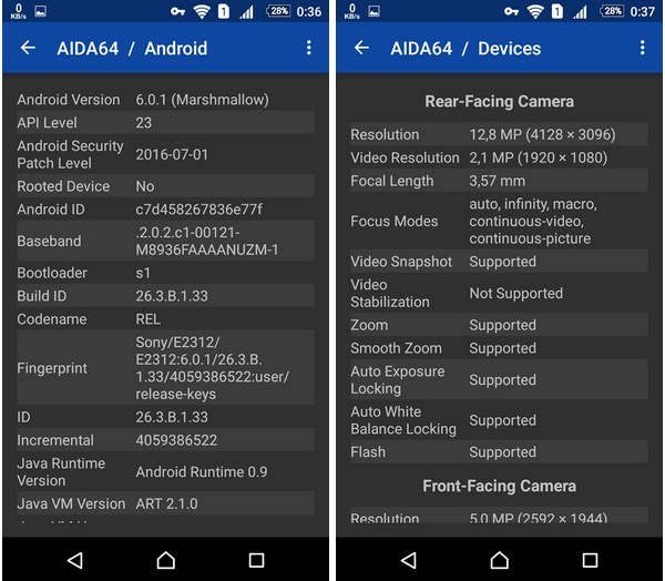 Tương tự Tại mục “Android” sẽ hiển thị các thông tin chi tiết về nền tảng trên thiết bị, như phiên bản Android đang sử dụng, trạng thái máy đã được bẻ khóa (root) hay chưa, ngôn ngữ, múi giờ của hệ thống... Trong khi đó, mục “Devices” sẽ hiển thị thông tin chi tiết về camera trên sản phẩm, như độ phân giải của camera trước/sau, hô trợ công nghệ ổn định hình ảnh hay không, có đèn flash, chức năng tự động lấy nét, cân bằng sáng... hay không.