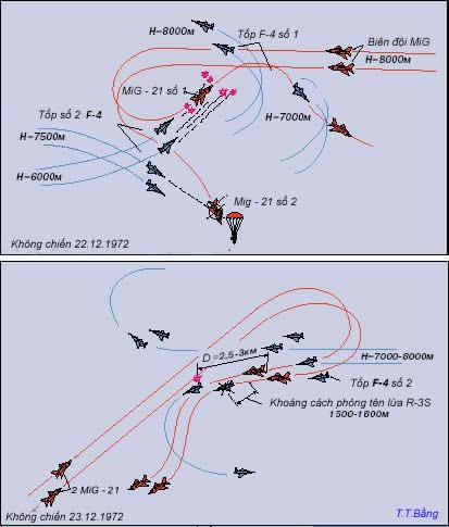 23.12. 13.41 từ sân bay Nội Bài, biên đội MiG 21 đã cất cánh đánh chặn cụm máy bay F- 4 từ hướng Lào vào Việt Nam trên độ cao 7000 – 8000 m. Thời tiết: mây mù cấp 10, chân mây 400m, trần mây 1200m, tầm nhìn xa từ 6 – 8 km. Dẫn đường từ sở chỉ huy trung đoàn. Sau khi cất cánh lấy độ cao 300 m, biên đội lấy đường bay góc dây cung 160 độ, sau 1,5 phút bay theo mệnh lệnh từ sở chỉ huy lấy đường bay góc dây cung 260 độ và tăng tốc độ cực đại chiếm độ cao.