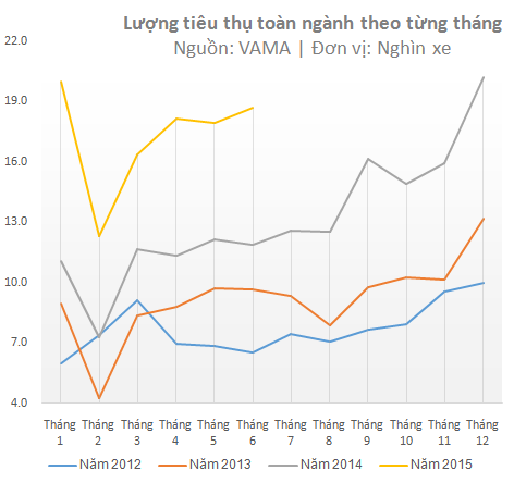 Tính đến hết tháng 6/2015, doanh số bán hàng của xe lắp ráp trong nước tăng 56% trong khi xe nhập khẩu tăng 64% so với cùng kì năm ngoái..