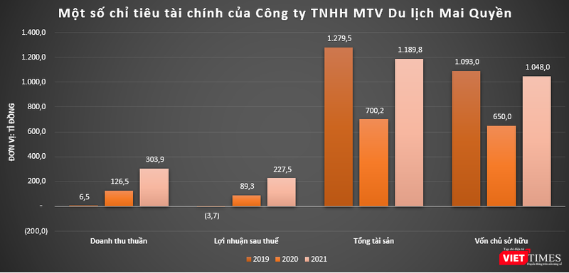Cụ thể, doanh thu thuần của công ty này tăng gấp 2,4 lần so với cùng kỳ năm trước, đạt 303,9 tỉ đồng. Tương tự, lợi nhuận sau thuế của Du lịch Mai Quyền trong năm 2021 đạt 182 tỉ đồng, cao gấp đôi so với cùng kỳ năm 2020, tương ứng với biên lợi nhuận ròng ở mức 59,89%.