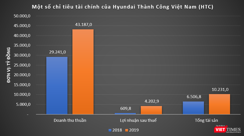 Hoạt động kinh doanh thuận lợi giúp Công ty Hyundai Thành Công Việt Nam (HTC) ghi nhận doanh thu thuần năm 2019 đạt tới 43.187 tỷ đồng, cao gấp 1,5 lần so với năm 2018. Lợi nhuận sau thuế của HTC cũng tăng vọt, đạt mức 4.202 tỷ đồng, cao gấp gần 7 lần so với năm 2018.
