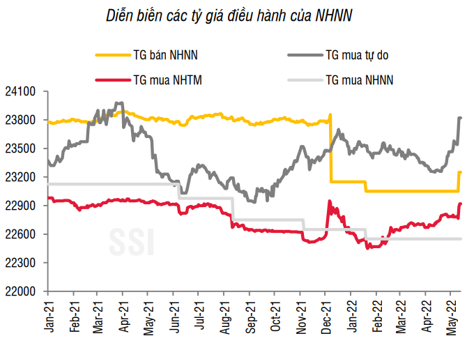 Theo SSI, tỉ giá tuy có tăng mạnh trong tuần nhưng chưa đến mức đáng lo ngại khi mức giá hiện tại mới tương đương so với cùng kỳ và vẫn thấp hơn 2,3% so với mức đỉnh được xác lập vào tháng 3/2020.