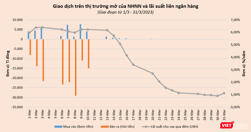 Thống kê của VietTimes cho thấy, trong hai tuần giao dịch cuối tháng 3/2023, nghiệp vụ thị trường mở (OMO) rơi vào trạng thái trầm lắng khi chỉ có duy nhất phiên ngày 20/3 Ngân hàng Nhà nước (NHNN) thực hiện bơm ròng 215,5 tỉ đồng, các phiên sau đó không có bất kỳ hoạt động bơm hút tiền nào.