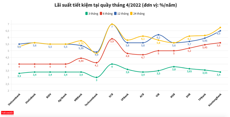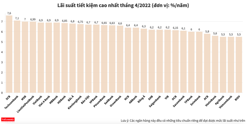 Mức lãi suất tiết kiệm cao nhất đang thuộc về SCB với 7,6%/năm. Tuy nhiên, khách hàng muốn nhận được mức lãi suất này cần phải gửi khoản tiền 500 tỷ đồng cho kỳ hạn 13 tháng...