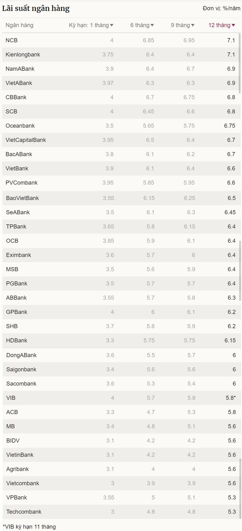 Các ngân hàng có vốn nhà nước và một vài ngân hàng tư nhân như ACB, VIB, VPBank, Techcombank, MB thậm chí chỉ yết lãi suất kỳ hạn một năm từ 5,3-5,8%.