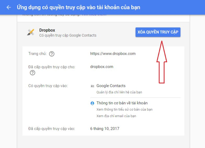 Nếu nhìn thấy cái tên không đáng tin, bạn hãy chặn họ bằng cách Xóa quyền truy cập. Sau khi bấm vào nút này, bạn phải bấm OK để xác nhận. Sau đó, nó sẽ biến mất khỏi danh sách ứng dụng có quyền truy cập tài khoản và không còn khả năng xem hay làm gì với email và dữ liệu khác của bạn nữa.