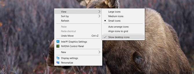 Windows cho phép ẩn toàn bộ biểu tượng desktop chỉ với vài nút nhấn, rất tuyệt vời nếu cần chụp màn hình desktop hoặc để "khoe" dàn máy khủng của mình mà không sợ các biểu tượng làm vướng mắt. Chỉ cần nhấp chuột phải vào desktop -> View -> Show desktop icons, chọn tắt mục này để ẩn biểu tượng (hoặc bật để hiện lại biểu tượng).