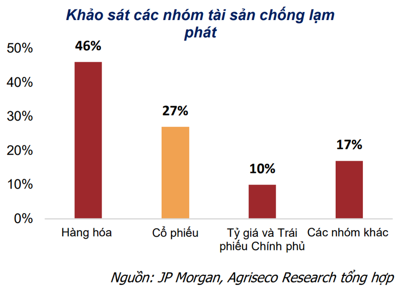 Đáng chú ý, báo cáo của AGR còn dẫn khảo sát của JP Morgan, thể hiện cổ phiếu là nhóm chống lạm phát hiệu quả thứ hai, sau nhóm hàng hoá. Không chỉ JP Morgan, nhiều tổ chức nghiên cứu lớn khác cũng có kết quả tương tự.