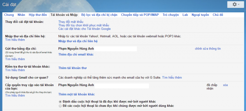 Việc làm đầu tiên để phát hiện xem có ai hack tài khoản Gmail của bạn chưa là bạn kiểm tra xem có ai liên kết vào tài khoản Gmail của mình nếu nghi ngờ tài khoản bị tấn công. Bấm nút bánh răng phía trên góc phải > Cài đặt > Tài khoản và nhập > Cấp quyền truy cập vào tài khoản của bạn. Tại đây, bạn xem nếu thấy có địa chỉ “lạ” liên kết thì cần xóa ngay.