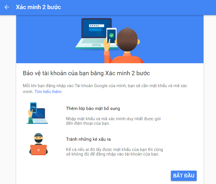 Đây là tính năng bảo mật có từ lâu của Google giúp ích rất nhiều trong việc bảo vệ trước hacker, bạn sẽ có thêm một lớp bảo vệ bằng mã số gửi đến điện thoại để đăng nhập thay vì chỉ có mật khẩu rất dễ bị xem trộm và xâm nhập.
