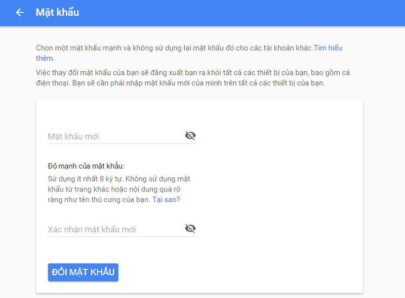 Mở giao diện Tài khoản của tôi > Đăng nhập và bảo mật > Đăng nhập vào Google > Mật khẩu > nhập mật khẩu cũ > sau đó tạo mật khẩu mới. Nội dung mật khẩu không nên là những con số dễ nhớ 12345 hay tên bạn, sinh nhật,… Bạn nên tạo mật khẩu kết hơp chữ thường và chữ hoa, các kí tự đặc biệt. Mật khẩu đăng nhập, bạn cũng đừng viết ra, gửi qua email hay nói cho bất cứ ai.