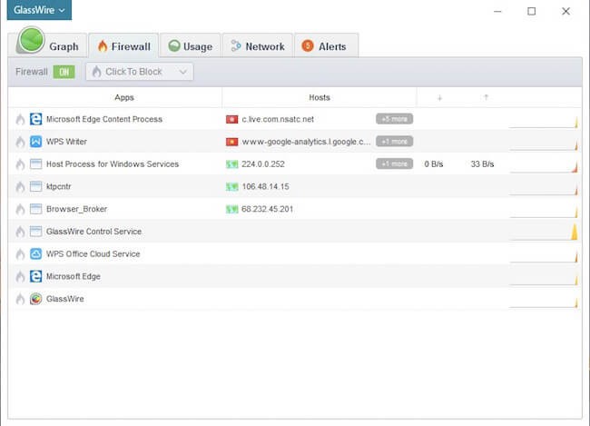 GlassWire có giao diện khá trực quan, hiển thị toàn bộ thông tin về các ứng dụng và những tiến trình đang chạy ngầm trên hệ thống. Ngoài ra, phần mềm này còn tích hợp sẵn tính năng tường lửa và an ninh hệ thống, đi kèm theo đó là các số liệu lưu lượng download/upload của từng ứng dụng. Nếu cảm thấy có điều gì bất thường, bạn có thể bấm vào biểu tượng đốm lửa ngay trước tên tiến trình để ngăn không cho kết nối Internet, và gỡ cài đặt ứng dụng ngay sau đó.