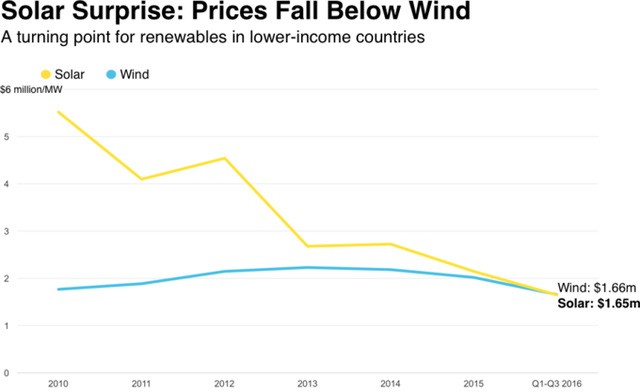 Trong quá khứ, điều này đã từng xảy ra tại một số dự án đơn lẻ. Nhưng nay, rất nhiều dự án điện mặt trời không cần trợ giá để hoạt động đã bắt đầu vượt qua than và khí thiên nhiên trên quy mô lớn. Và đáng chú ý, tại các thị trường đang phát triển chi phí xây dựng các nhà máy điện mặt trời đang rẻ hơn so với xây dựng các dự án điện gió.